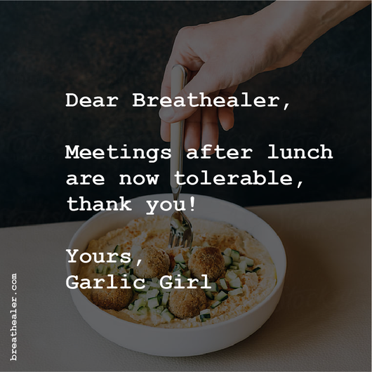 Don't give up that garlic! Just carry around our conveniently sized Breathealer bottle instead. PS did we mention that it has 150 squirts, so you are good for a while! Live your life to the fullest and trust that we have your back - or more so your mouth :p.